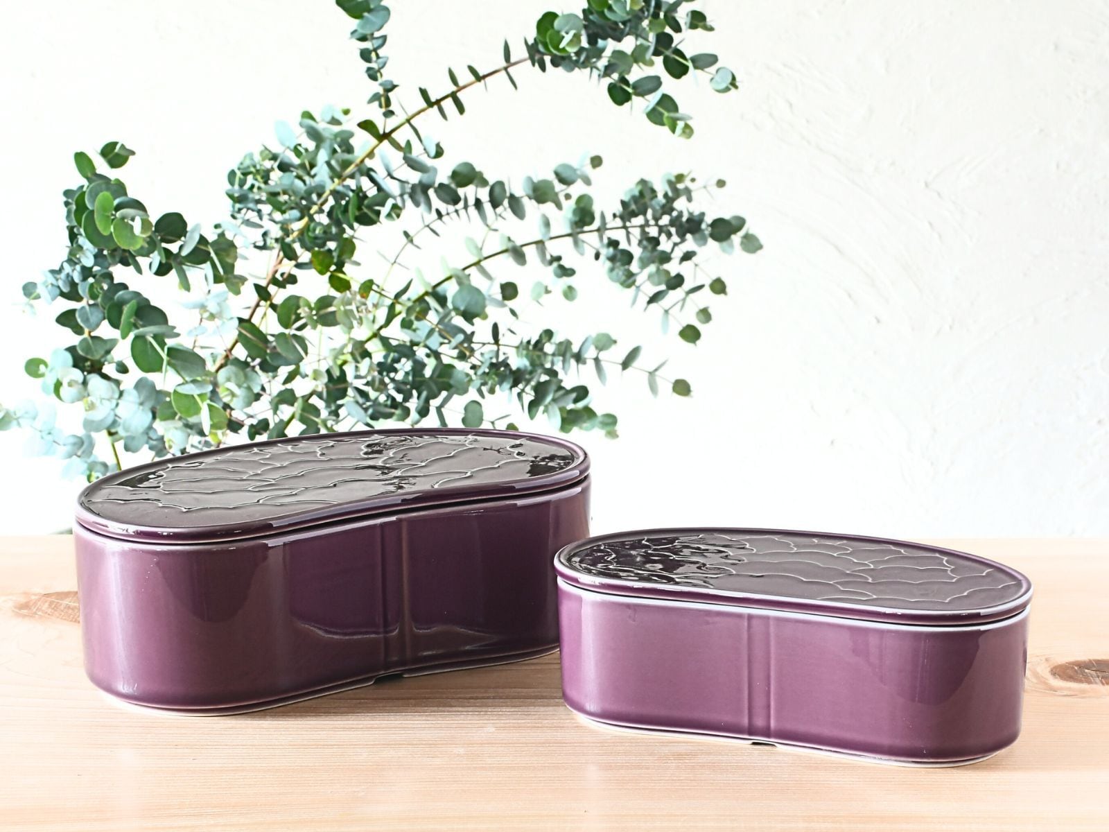 有田焼の紫釉 繭型陶箱なら、和洋問わずどんな料理にも調和します。きれいな深い紫色の釉薬に絶妙な繭型デザインが、上品で高級感を漂わせます。普段使いだけでなく特別な日にもピッタリです。蓋は台皿として、身は重箱のよう重ねられる形状になっています。